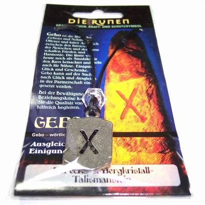 Runa GEBO este o runa pozitiva, care aduce bucurie in suflet si o relatie de parteneriat benefica, fie ca este vorba de sentimente, fie ca este vorba de afaceri. Ajuta la reconcilierea in urma unei dispute. Cristalul de stanca, in aceasta combinatie, simbolizeaza sume de bani sau bunuri materiale neasteptate, care vor veni catre dvs. Dimensiune: aprox. 3 x 2 x 0,4 cm